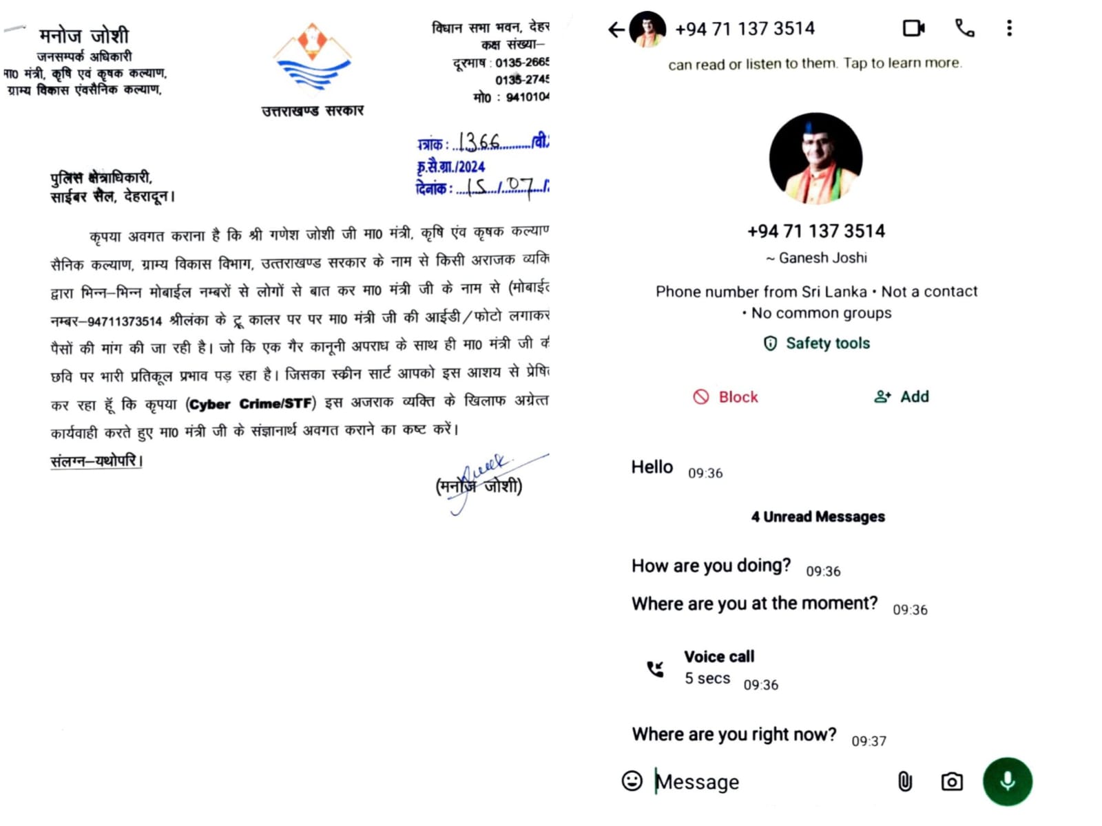 देहरादून : कैबिनेट मंत्री गणेश जोशी के नाम से किसी अराजक व्यक्ति द्वारा भिन्न-भिन्न मोबाईल नम्बरों से लोगों से बात कर कैबिनेट मंत्री गणेश जोशी के नाम से (मोबाईल नम्बर-94711373514 श्रीलंका के टू कालर पर कैबिनेट मंत्री गणेश जोशी की आईडी / फोटो लगाकर) पैसों की मांग की जा रही है, जिससे मंत्री गणेश जोशी की छवि पर भारी प्रतिकूल प्रभाव पड़ रहा है।