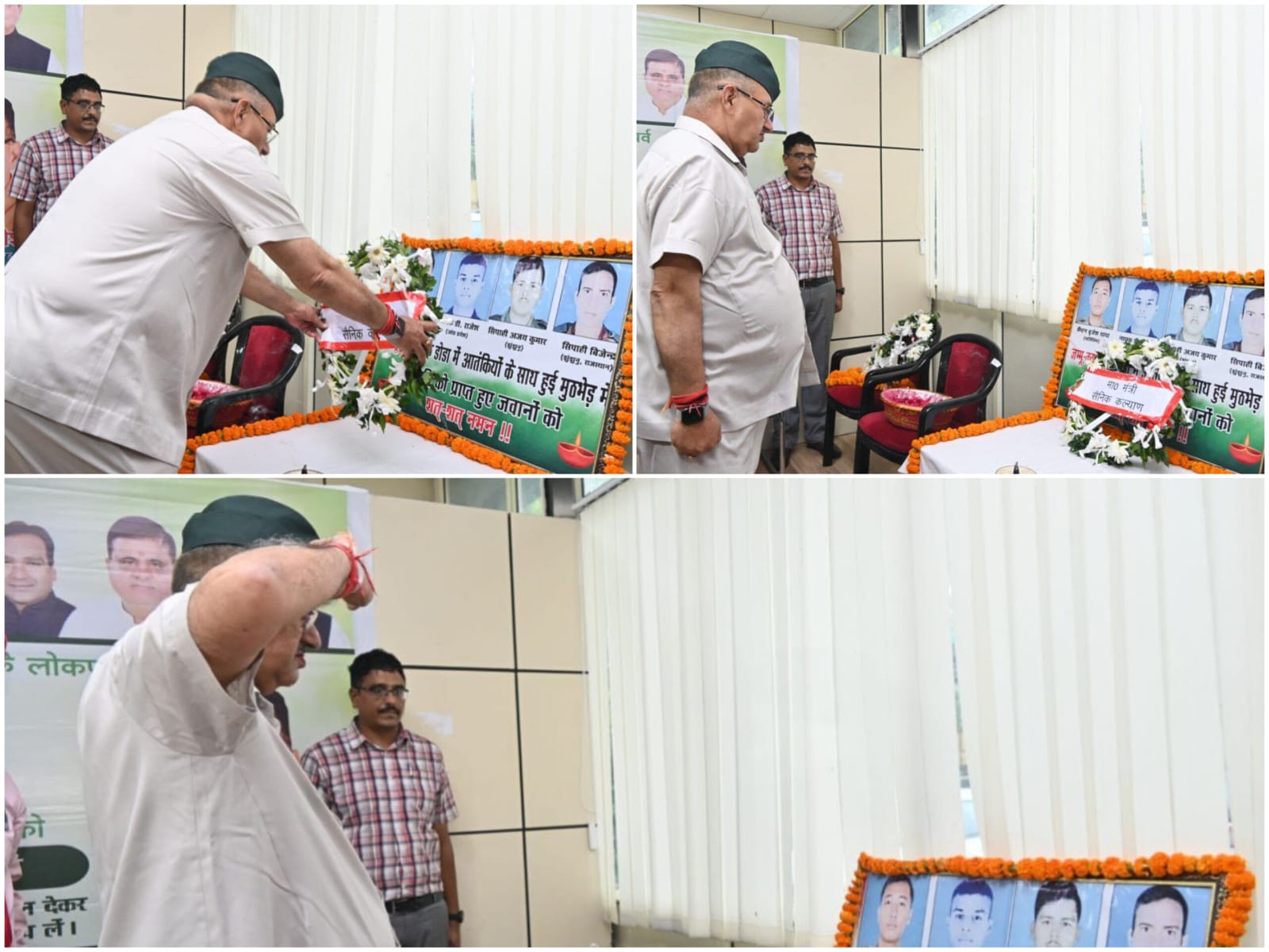 देहरादून : सैनिक कल्याण मंत्री गणेश जोशी ने जम्मू के उरार बागी, डोडा में आतंकियों के साथ मुठभेड़ के दौरान शहीद हुए भारतीय सेना के जवानों की शहादत पर हाथी बड़काला स्थित कैंप कार्यालय में आयोजित श्रद्धांजली कार्यक्रम में प्रतिभाग कर शहीदों को पुष्पचक्र अर्पित कर भावपूर्ण श्रद्धांजलि दी।