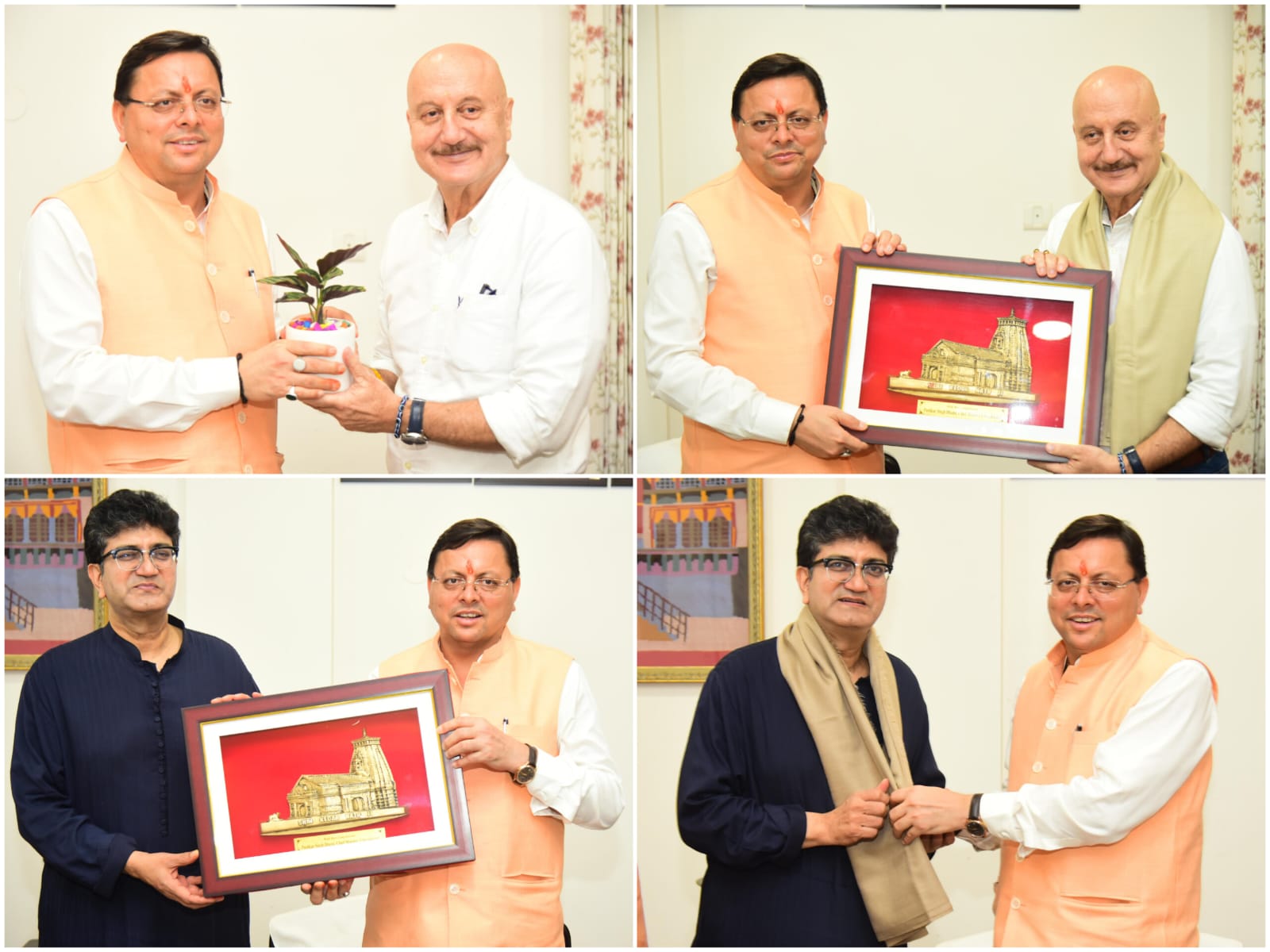 देहरादून : मुख्यमंत्री पुष्कर सिंह धामी ने मंगलवार को मुख्यमंत्री आवास में केंद्रीय फिल्म प्रमाणन बोर्ड के अध्यक्ष प्रसून जोशी तथा फिल्म अभिनेता अनुपम खेर ने भेट की उन्होने प्रदेश में फिल्म निर्माण एवं फिल्मांकन से सम्बधित विभिन्न विषयों तथा प्रदेश में फिल्म निर्माण हेतु राज्य सरकार द्वारा दी जा रही है विभिन्न सुविधाओं पर चर्चा की। उन्होने राज्य की नई फिल्म नीति 2024 को फिल्मों को बढावा देने वाला प्रयास बताते हुए राज्य की फ़िल्म नीति के लिए मुख्यमंत्री पुष्क़र सिंह धामी का आभार भी व्यक्त किया। उन्होंने कहा कि नई फिल्म नीति से उत्तराखण्ड में फ़िल्मांकन के लिए और अधिक बढ़ावा मिलेगा।