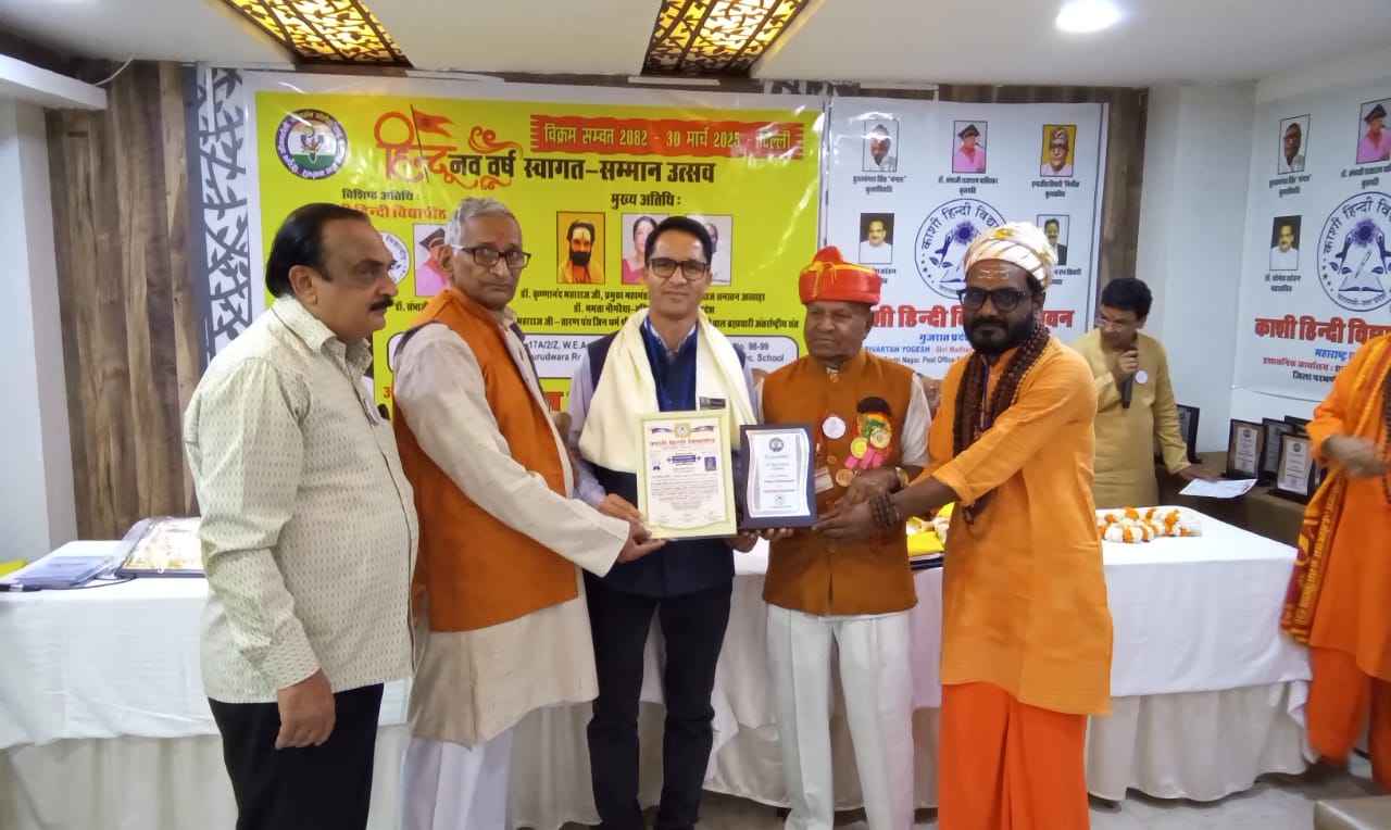 मसूरी : हिन्दू नववर्ष स्वागत, सम्मान उत्सव के अवसर पर काशी हिन्दी विद्या पीठ ने दिल्ली में राष्ट्र भाषा के प्रचार-प्रसार व विकास हेतु किये जा रहे विशिष्ठ योगदान के लिये साहित्य शिरोमणियों तथा ख्यातिलब्ध जनों को सम्मानित करने हेतु सम्मान समारोह आयोजित किया गया। जिसमें उत्तराखण्ड के शिक्षक, कवि एवं राजनीतिक चिंतक डॉ नेत्रमणि बडोनी अविरल को उनकी सुदीर्घ हिन्दी सेवा, शैक्षिक उपलब्धियाँ हिन्दी साहित्य लेखन, तथा सामाजिक व राजनीतिक चेतना हेतु किये गये कार्यों के लिये विद्या वाचस्पति पीएचडी की मानद उपाधि से काशी हिन्दी विद्या पीठ के कुलपति डॉ संभाजी राजाराम बाविस्कर ने सम्मानित किया व साथ ही विद्या पीठ की लाइफटाइम सदस्यता प्रदान की गयी।