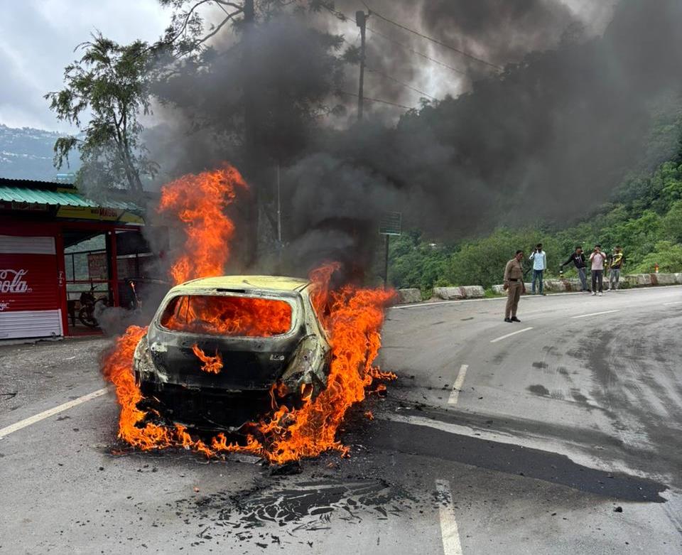 मसूरी : दिल्ली से परिवार के साथ मसूरी घूमने आ रहे पर्यटकों की कार में गलोगी धार के पास अचानक आग लग गयी, लेकिन आग लगते ही कार सवार उतर गये वरना बड़ी घटना हो सकती थी। सूचना पर फायर ब्र्रिगेड के सदस्य मौके पर पहुंचे व आग बुझायी लेकिन तब तक कार पूरी तरह से जल चुकी थी।