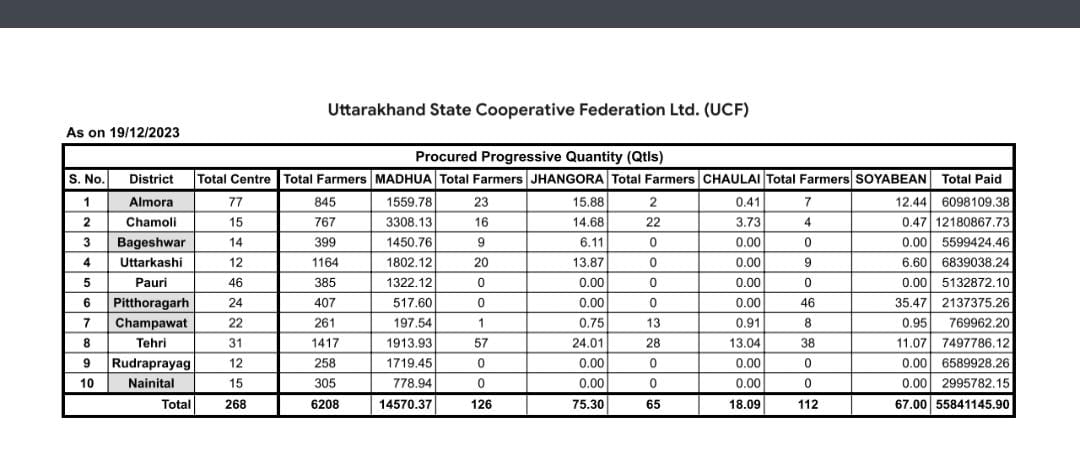 खूब प्रयासरत है। झंगोरा, चोलाई और सोयाबीन। इन अनाजों की खरीद राज्य भर में शीर्ष सहकारी संस्था राज्य सहकारी संघ द्वारा की जा रही है।