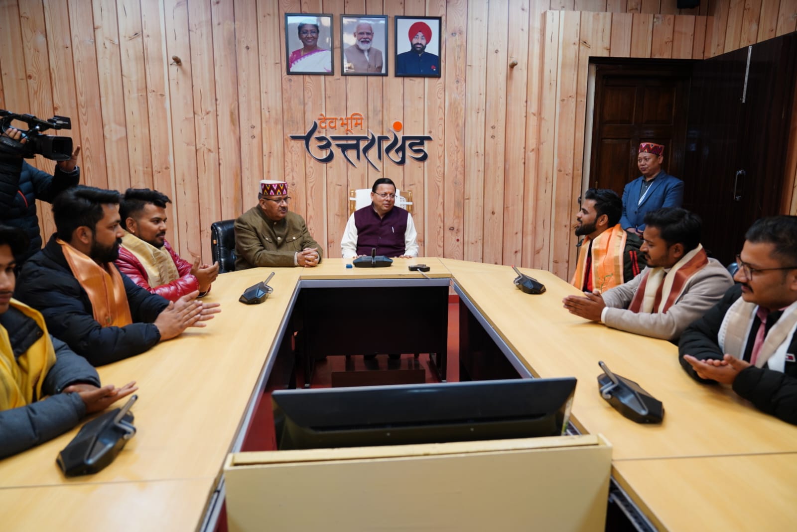 देहरादून : रविवार को मुख्यमंत्री पुष्कर सिंह धामी से मुख्यमंत्री आवास में उत्तराखण्ड के युवाकलाकार लोकगायक हरू जोशी, नीरज चुफाल के साथ कॉमेडियन सौरभ सिंह एवं सिनेमा जगत से विट्टू मंमगांई, अशुतोष कुमार, देवेन्द्र सिंह खोलिया तथा गौरव राणा ने भेंट की।