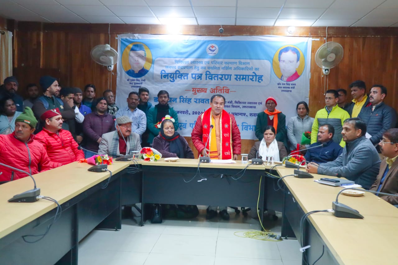 रुद्रप्रयाग : उत्तराखंड चिकित्सा स्वास्थ्य सशक्तिकरण अभियान के तहत सोमवार को विकास भवन सभागार में स्वास्थ्य विभाग की ओर से नियुक्ति पत्र वितरण कार्यक्रम आयोजित किया गया। कार्यक्रम के मुख्य अतिथि स्वास्थ्य मंत्री डॉ. धन सिंह रावत ने कार्यक्रम का शुभारंभ करते हुए 53 नवनियुक्त नर्सिंग अधिकारियों को नियुक्ति पत्र प्रदान किए। एक दिवसीय जनपद भ्रमण कार्यक्रम पर पहुंचे स्वास्थ्य मंत्री डाॅ. धन सिंह रावत का जिलाधिकारी सौरभ गहरवार ने पुष्प गुच्छ भेंट कर स्वागत किया, तथा जनपद आगमन पर जन प्रतिनिधियों द्वारा भी फूल मालाओं के साथ स्वास्थ्य मंत्री का स्वागत एवं अभिनंदन किया गया।