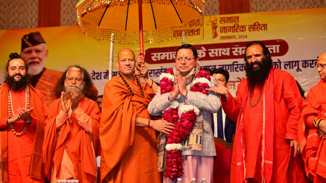 मुख्यमंत्री पुष्कर सिंह धामी ने प्रयागराज में रविवार को आचार्य शिविर में आयोजित समानता के साथ समरसता कार्यक्रम में प्रतिभाग किया। इस अवसर पर सभी संतों ने उत्तराखंड राज्य में सर्वप्रथम समान नागरिक संहिता (यूसीसी) लागू करने पर मुख्यमंत्री का अभिनंदन किया। संतो द्वारा पुष्पमाला के साथ मुख्यमंत्री को सम्मानित किया गया। इस अवसर पर मुख्यमंत्री ने सभी संतों को धन्यवाद अर्पित करते हुए कहा कि त्रिवेणी की पवित्र भूमि और महाकुंभ के शुभ अवसर पर पूज्य संतों का आशीर्वाद मिलना सौभाग्य की बात है। उन्होंने कहा प्रधानमंत्री नरेंद्र मोदी की विकसित भारत की कल्पना में पूज्य संतों का आशीर्वाद सबसे जरूरी है। उन्होंने कहा समान नागरिक संहिता लागू करना, विकसित भारत की ओर कदम बढ़ाना है। मेरा जो सम्मान संतों ने किया है, वो उत्तराखंड के प्रत्येक नागरिक का सम्मान है। मुख्यमंत्री ने कहा कि 2022 विधानसभा चुनाव से पहले हमने उत्तराखंड की जनता के सामने समान नागरिक संहिता लागू करने का संकल्प रखा था। जनता ने हमें अपना आशीर्वाद दिया। सरकार बनने के बाद सबसे पहले मंत्रिमंडल की बैठक में समान नागरिक संहिता के लिए कमेटी का गठन किया गया। जिसके बाद प्रधानमंत्री के नेतृत्व में उत्तराखंड की राज्य सरकार ने देश की आजादी के बाद सबसे पहले उत्तराखंड में समान नागरिक संहिता लागू की। मुख्यमंत्री ने कहा कि संविधान निर्माताओं ने भी समान कानूनों का प्रावधान किया था। उत्तराखंड देवभूमि है, हमारा राज्य गंगा, यमुना, चार धामों, आदि कैलाश, संतों का प्रदेश है। उत्तराखंड राज्य में प्रत्येक घर का सदस्य सेना में है। देश के हर स्थान में देवभूमि का युवा, मां भारती की सेवा कर रहा है।