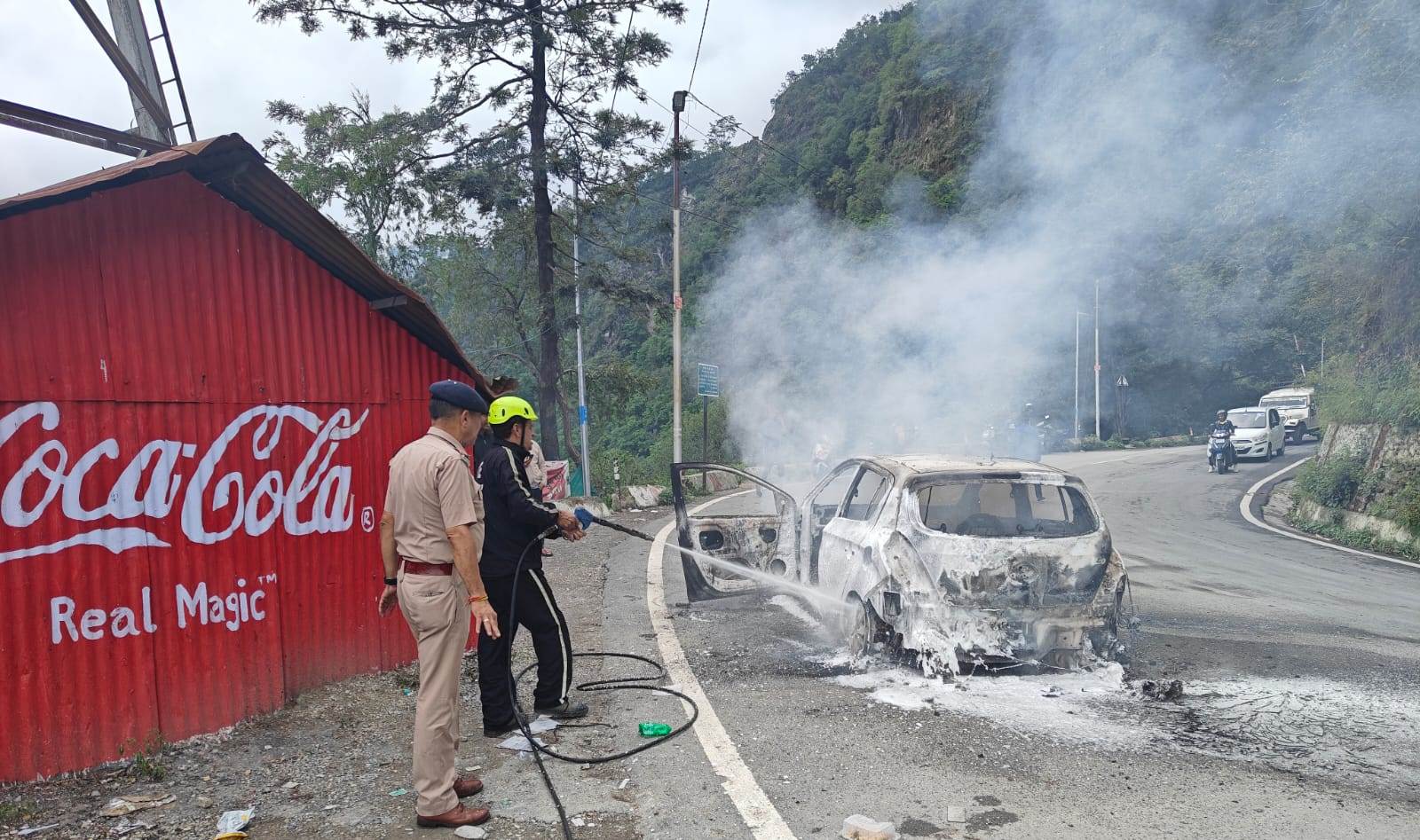 मसूरी : दिल्ली से परिवार के साथ मसूरी घूमने आ रहे पर्यटकों की कार में गलोगी धार के पास अचानक आग लग गयी, लेकिन आग लगते ही कार सवार उतर गये वरना बड़ी घटना हो सकती थी। सूचना पर फायर ब्र्रिगेड के सदस्य मौके पर पहुंचे व आग बुझायी लेकिन तब तक कार पूरी तरह से जल चुकी थी।